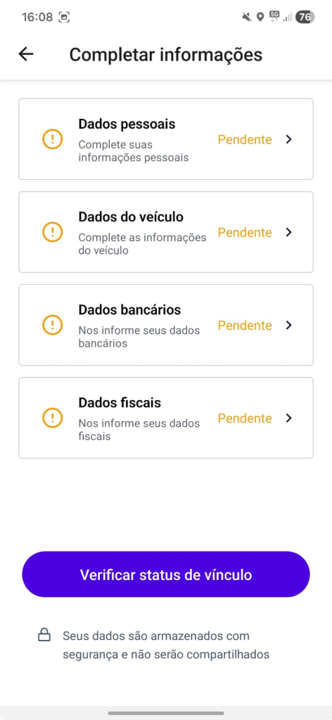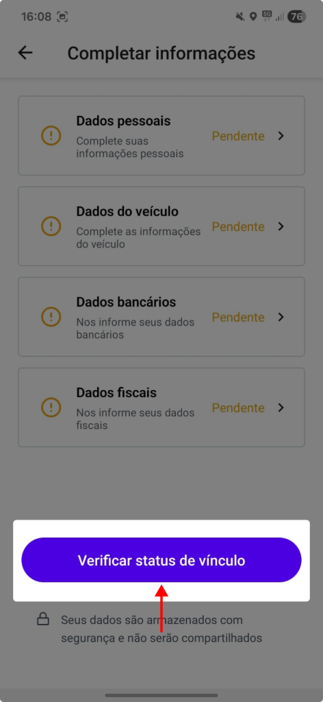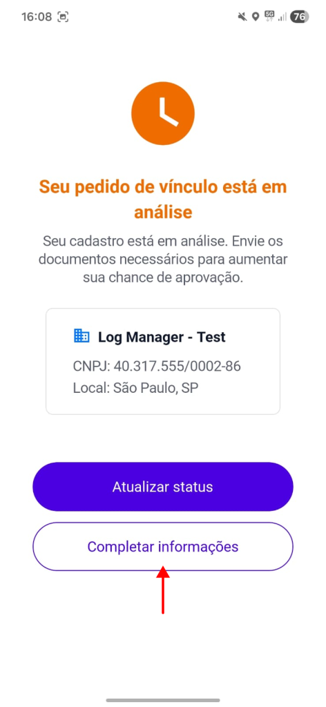 1. Com a solicitação de vínculo enviada, o motorista deve completar as demais informações para aumentar as chances de aprovação. Para isso, toque em “Completar informações” na tela de aprovação.
