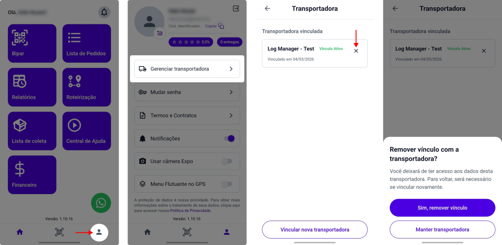 Caso deseje se desvincular de uma transportadora, siga os seguintes passos no aplicativo da Log Manager: