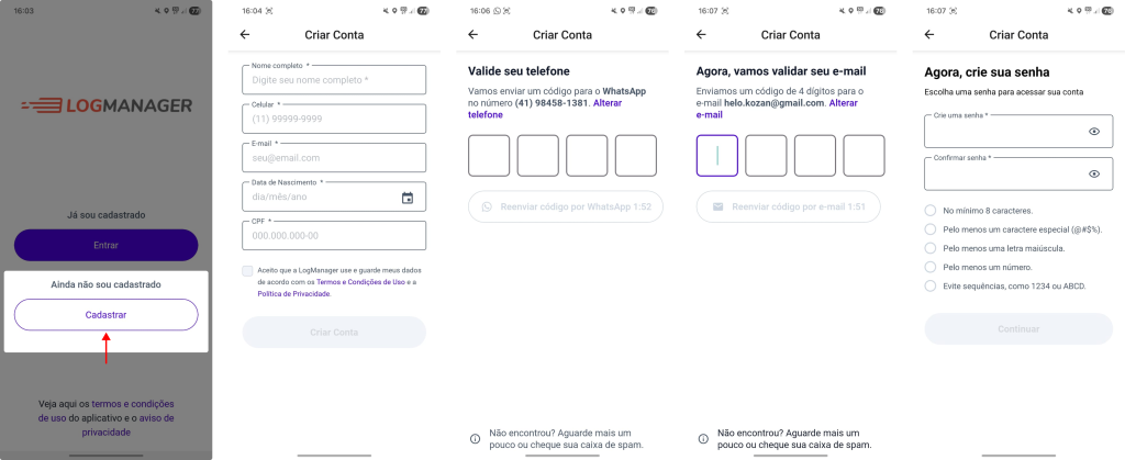 Agora você está pronto para fazer seu autocadastro de forma rápida e autônoma no app da Log Manager!
