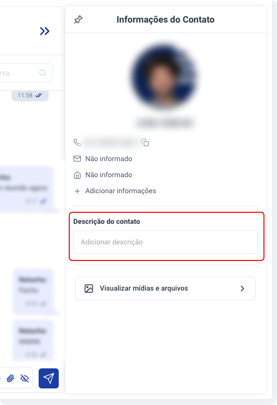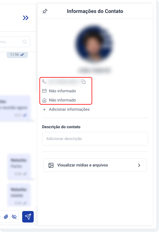 2. Uma barra lateral irá abrir, contendo informações básicas sobre o contato, com a possibilidade de adicionar outras informações.