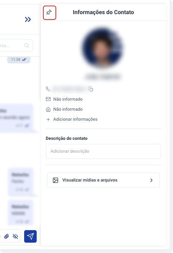 Clique no ícone indicado na imagem para fixar a barra, que ficará aberta o tempo todo mesmo na troca de conversas, mostrando as informações do contato da conversa selecionada.