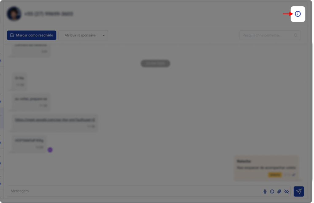 1. Com uma conversa aberta, clique no ícone indicado na imagem para abrir mais informações sobre o contato.