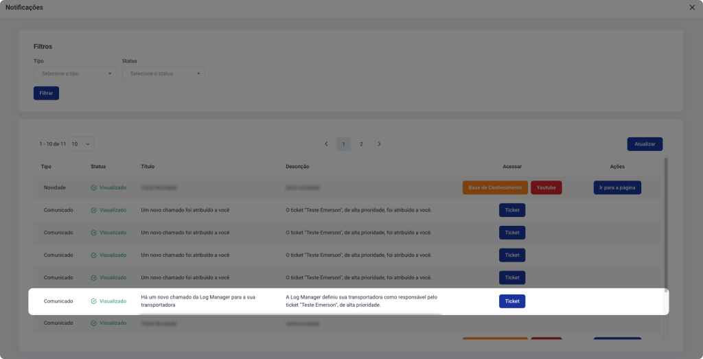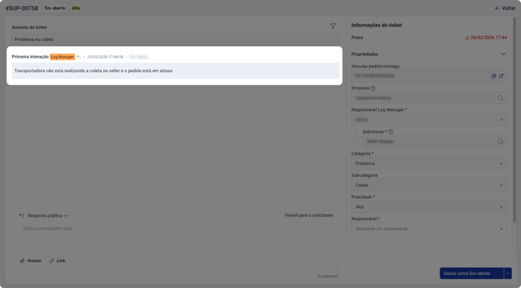 Nesse caso, a transportadora é notificada e o ticket atribuído pela Log Manager fica visível no seu painel da Central de Tickets para que a tratativa seja realizada pela sua equipe.