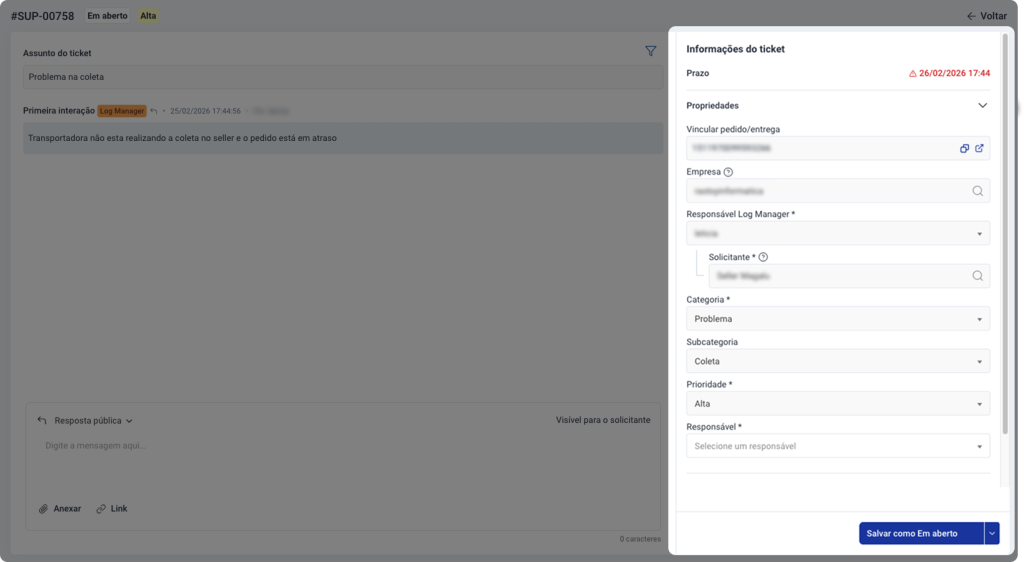 A Log Manager pode incluir a sua transportadora como responsável por chamados abertos pela nossa equipe em cenários em que precisamos dessa atuação externa para a resolução de algumas solicitações.