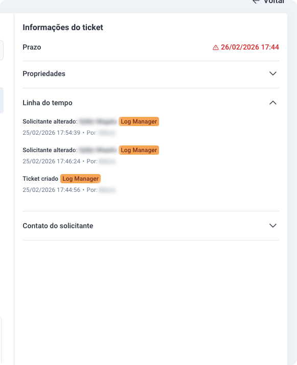 - Um novo campo foi adicionado (responsável Log Manager), que indica quem abriu o ticket na Log Manager.