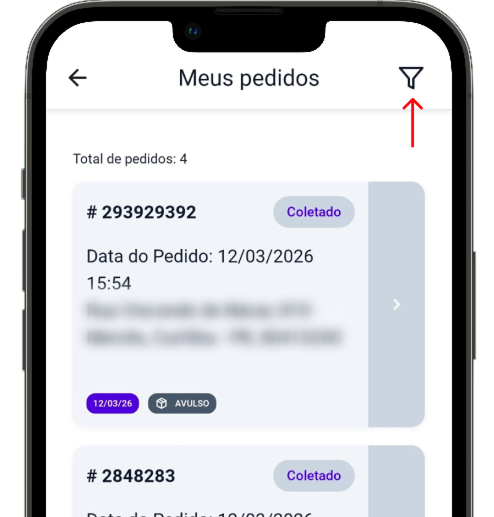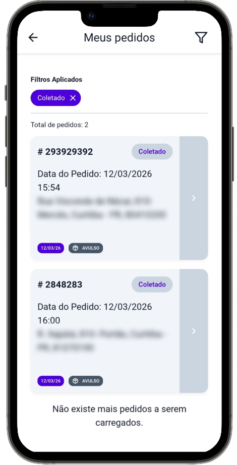 - Filtro por status: aqui você pode buscar o pedido por status. Ex.: Selecione “Coletado” para buscar todos os pedidos que foram coletados por você.