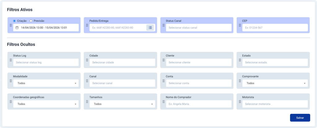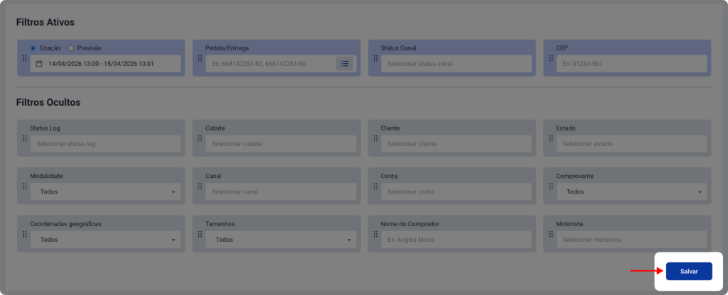 2. A visualização dos filtros irá aparecer separada em Filtros Ativos e Filtros Ocultos
