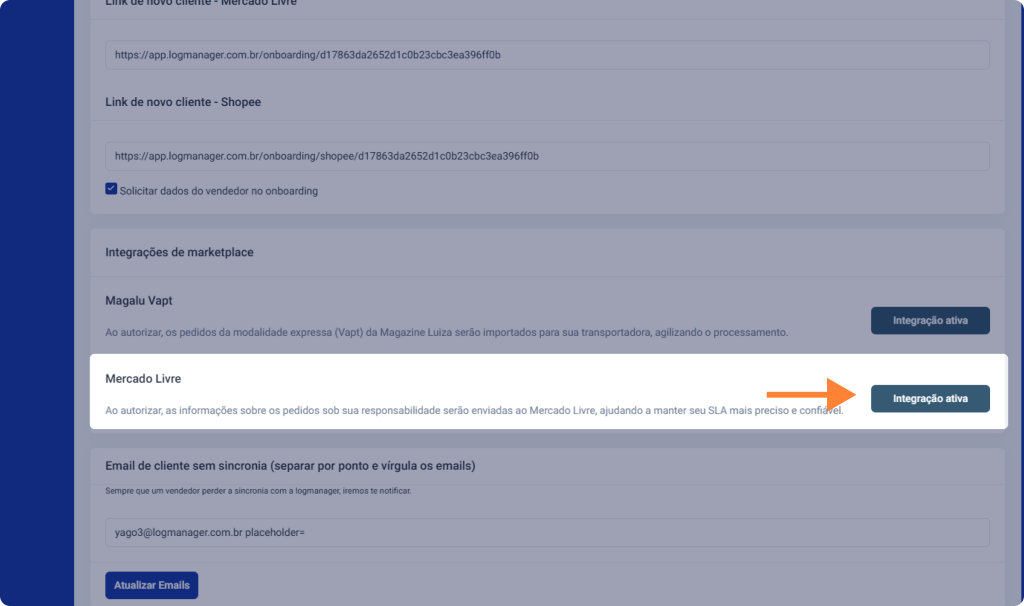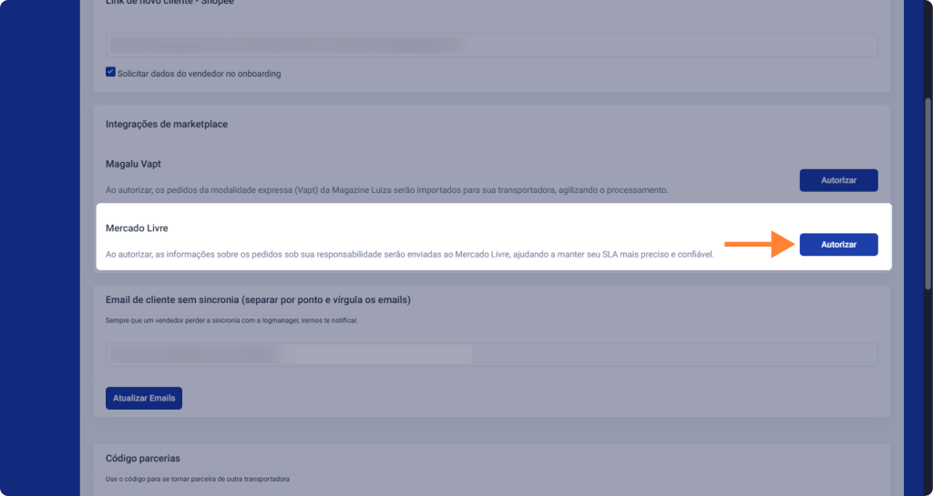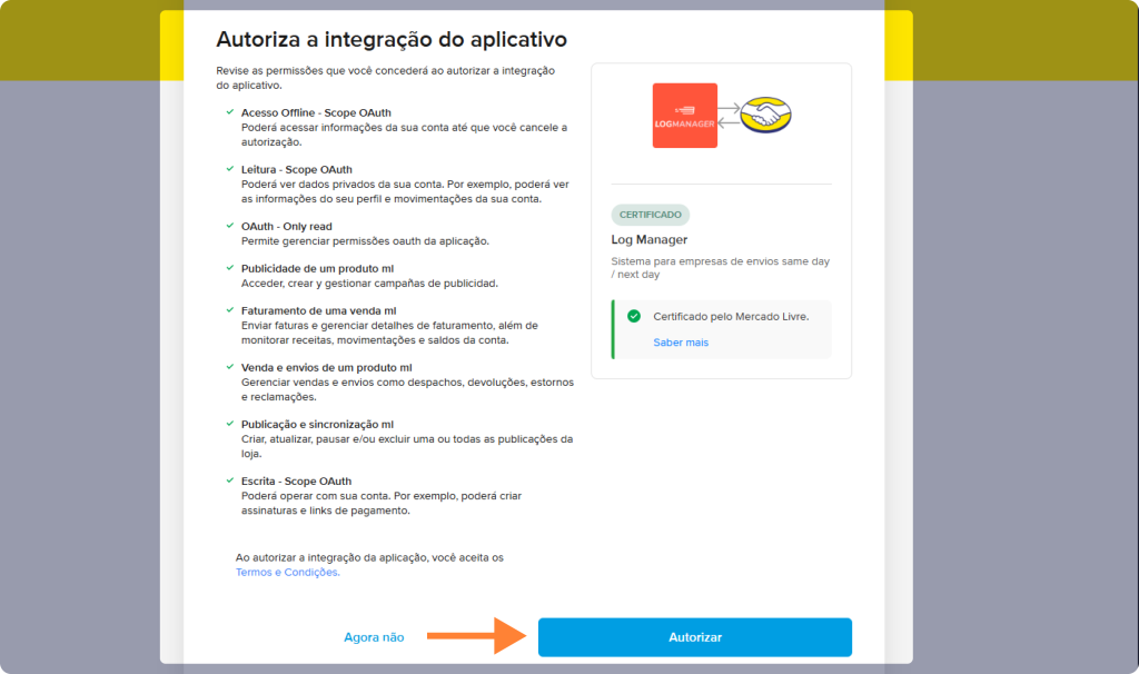 5. Concluído o processo, você será redirecionado de volta ao painel da LogManager e sua integração com o Mercado Livre estará ativa.