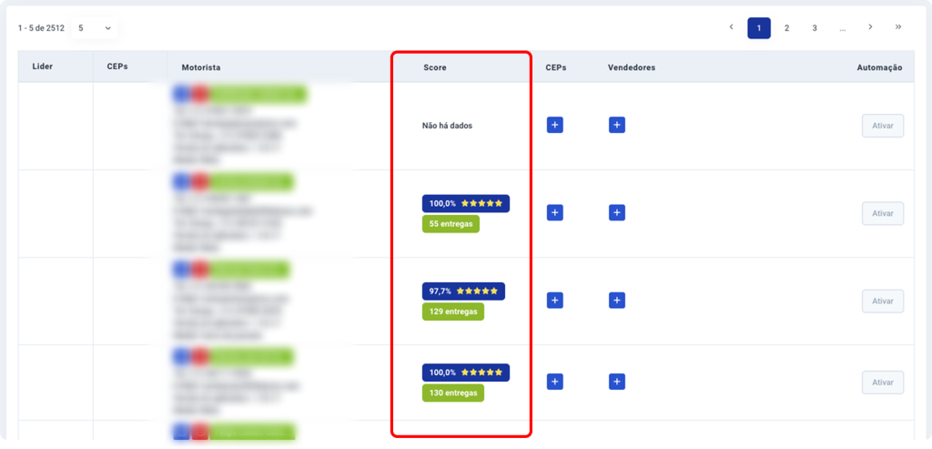 Na tabela de motoristas na página selecionada, há uma coluna “score”, que mostra qual o score do motorista e o número total de entregas.