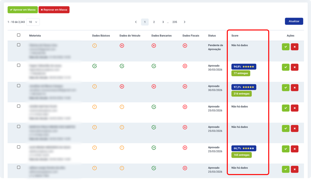 É possível visualizar o score dos motoristas na tela de Cadastro dos Motoristas e na tela do Pré-Cadastro de Motoristas.