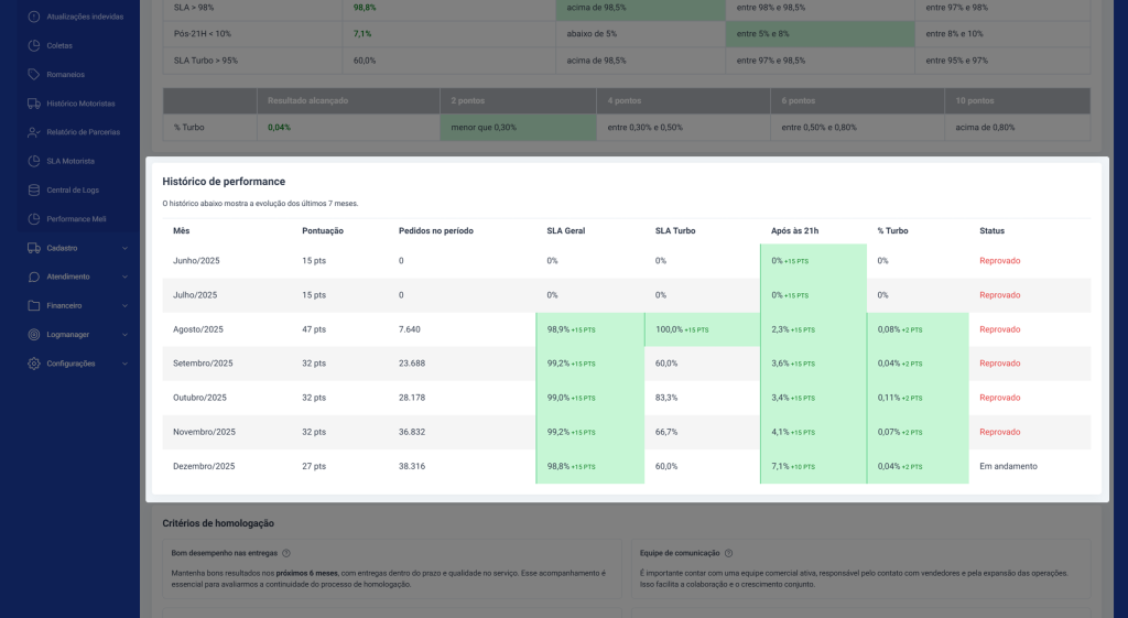 - Volumetria mínima: indica se sua transportadora atingiu o mínimo de 25 mil entregas por mês.