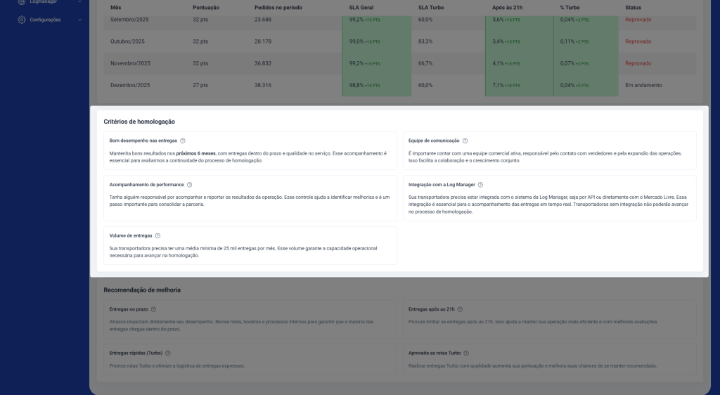 - Status atual: exibe em qual classificação (Recomendada, Homologada ou Homologada Premium) sua transportadora se encontra no momento.