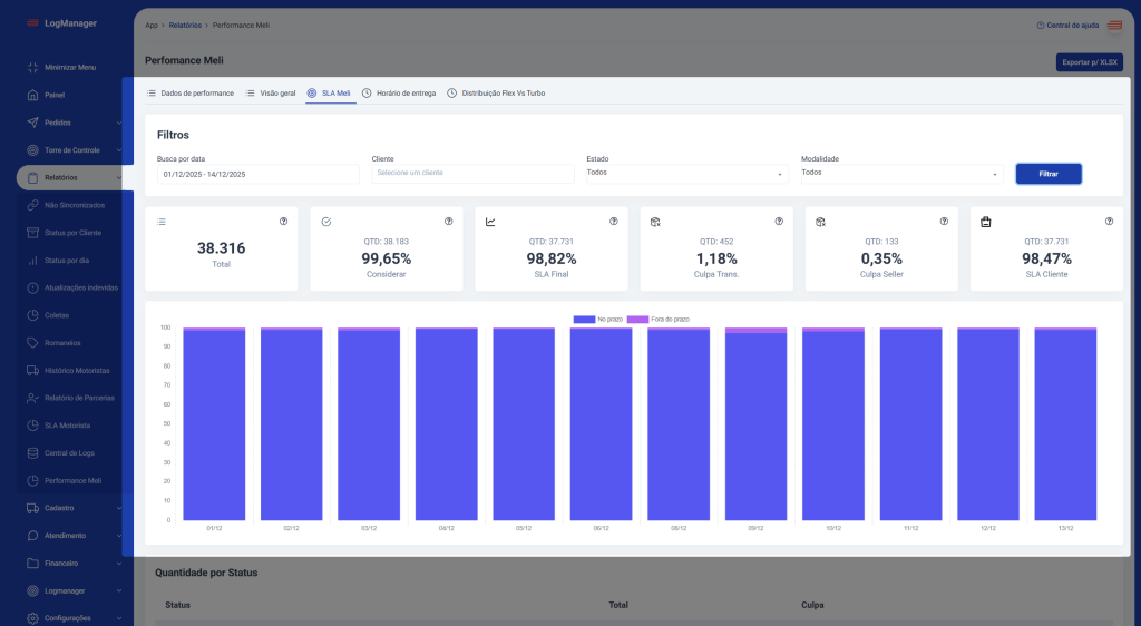- Gráfico de desempenho: visualização das entregas no prazo e fora do prazo dia a dia do intervalo filtrado