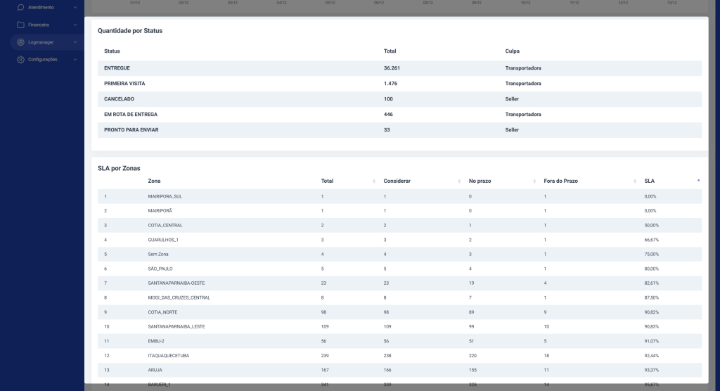 - SLA por zonas: detalhamento por região, mostrando quantas entregas você teve em cada zona, quantas foram dentro e fora do prazo e seu SLA naquela região.